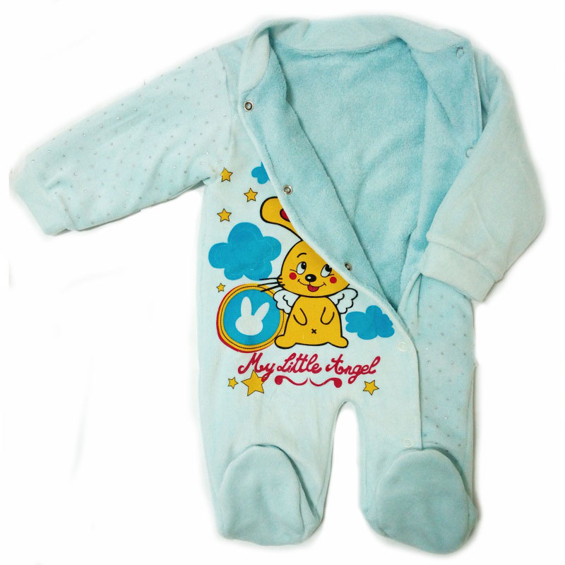 Комбинезон без капюшона, с закрытыми ножками, рукава на манжете, спереди на кнопочках от воротничка до конца ножки. Украшен спереди рисунком персонажей из мультиков.